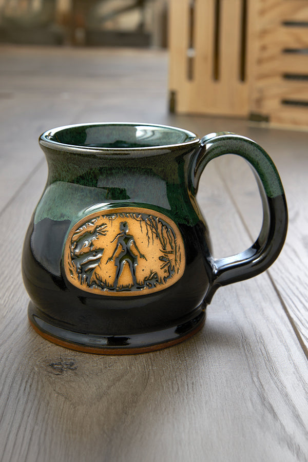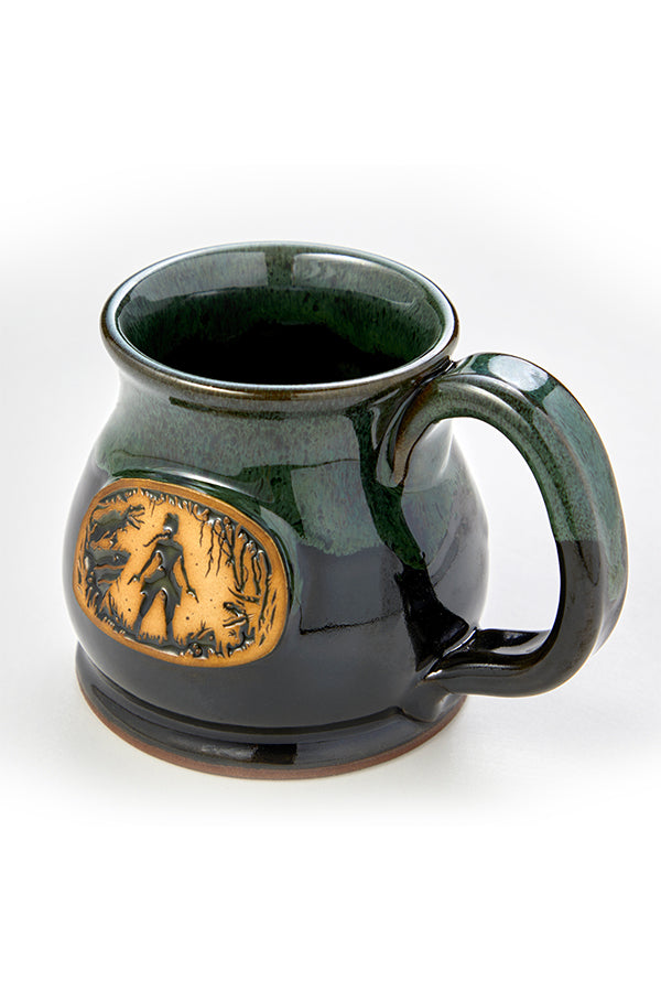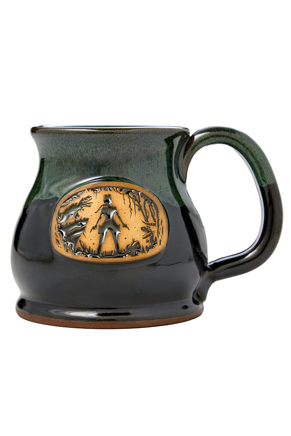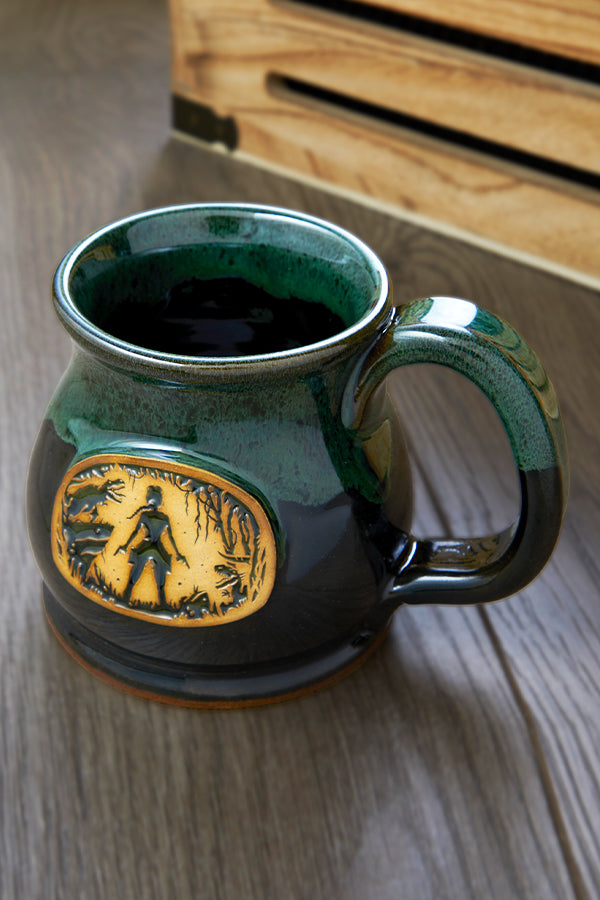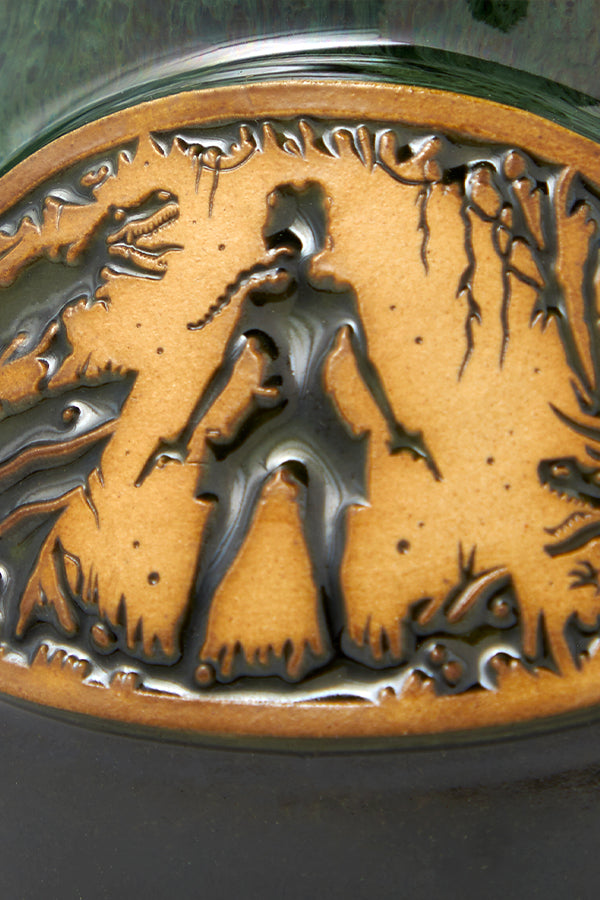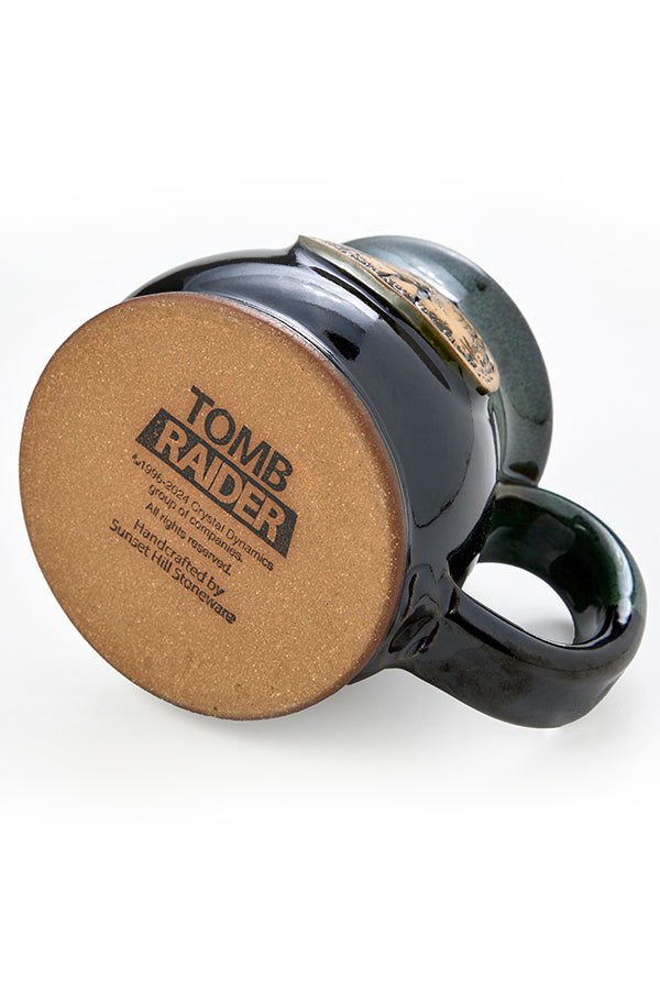 Hostile creatures on land and in sea have been no match for Lara since 1996. Celebrate a legacy set in stone with every sip from your Tomb Raider Showdown Stoneware Mug. It sports Lara Croft in silhouette, surrounded by enemies. Cast in ceramic, this image sits at the center of a royal green mug with an elegant, curved shape and a glossy glaze on top. It’s an earthy piece of drinkware that’s a delight to use and display.